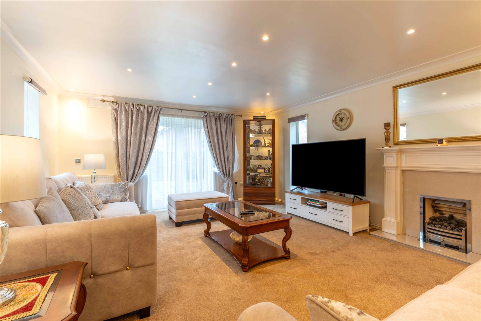 The sizeable living room is flooded with natural light, with two near full-length windows either side and a large pair of glass French doors leading out into the garden, creating a bright and welcoming main living space.