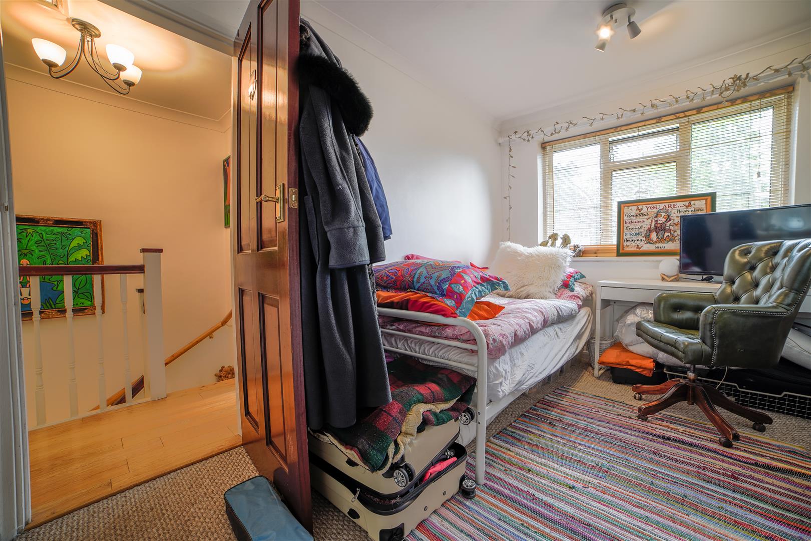Moving upstairs, you will find the principal bedroom, which offers a touch of elegance with its French doors that open out onto a rooftop area, extending the feel of the room and offering views on the rear garden. The house showcases meticulous attention to detail, with quality finishes and a cosy ambiance that adds to its charm.